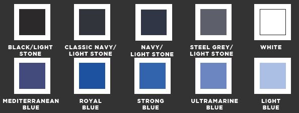 Black/Light Stone, Classic Navy/Light Stone, Navy/Light Stone, Steel Grey/Light Stone, White, Mediterranean Blue, Royal Blue, Strong Blue, Ultra Marine Blue, Light Blue